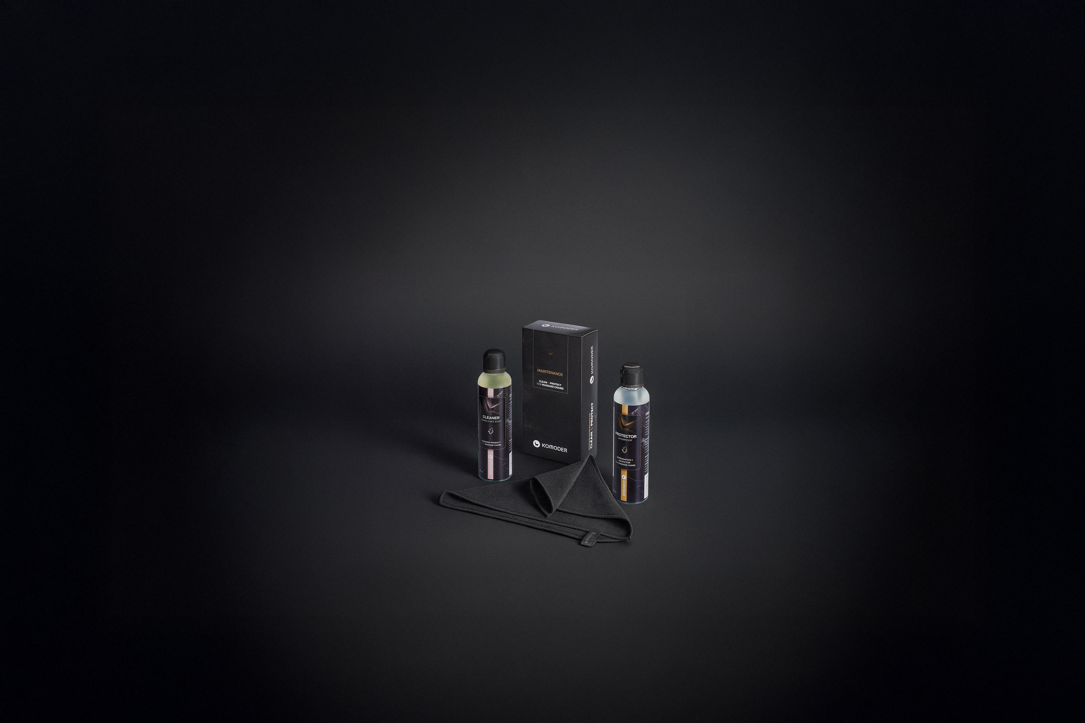 To be fully satisfied with our products, we offer a maintenance kit consisting of two special bottles: one with a cleaning substance and the other with a substance that provides material protection. The cloth included is specially designed to wipe away all traces.