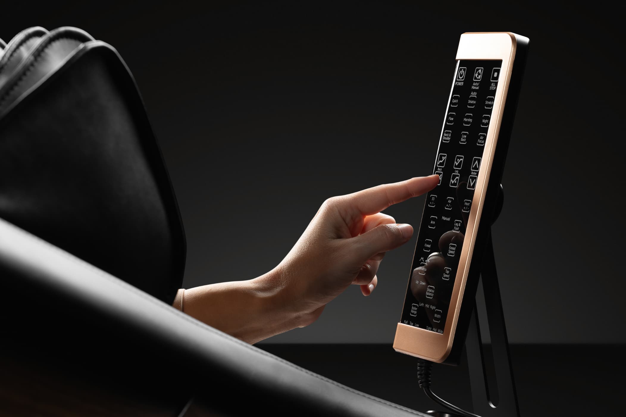 De CIRRUS I-massagestoel is eenvoudig te bedienen met een afstandsbediening die op de standaard is geplaatst. Met deze afstandsbediening kunt u de hele massage-ervaring regelen. De standaard houdt de afstandsbediening op de juiste hoogte, zodat u er gemakkelijk bij kunt.