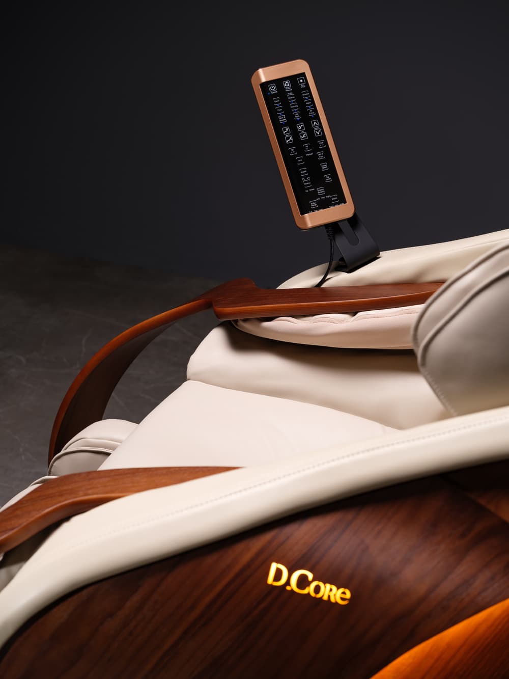Het topmodel van D.CORE verenigt alle ervaring van Inada Soshu en Dr. Takehiro Isawa in een product dat ongeëvenaard is in de industrie. De elegante vormen, geaccentueerd door de walnotenhouten armen en het decor, maken van D.CORE Cirrus een gastvrij en uitnodigend geheel, compleet toegewijd aan uw welzijn!